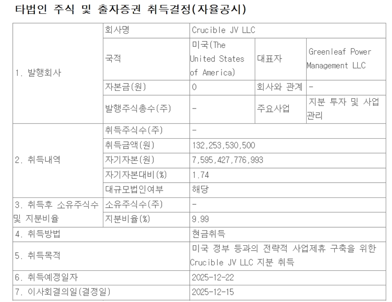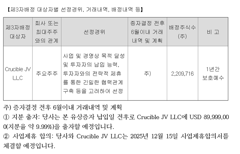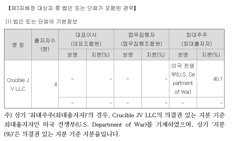 놀랍게도 이 3자배정 유상증자로 발행될 신주를 100% 떠안는 곳은 미국내에 새로 세워지는 합작법인 Crucible JV LLC다. 이 합작법인의 최대주주는 미국 전쟁부로 지분율 40.1%이며, 미국 상무부(보조금 2.1억달러 출자)와 고려아연(출자금 9천만달러)도 주주들이다.
