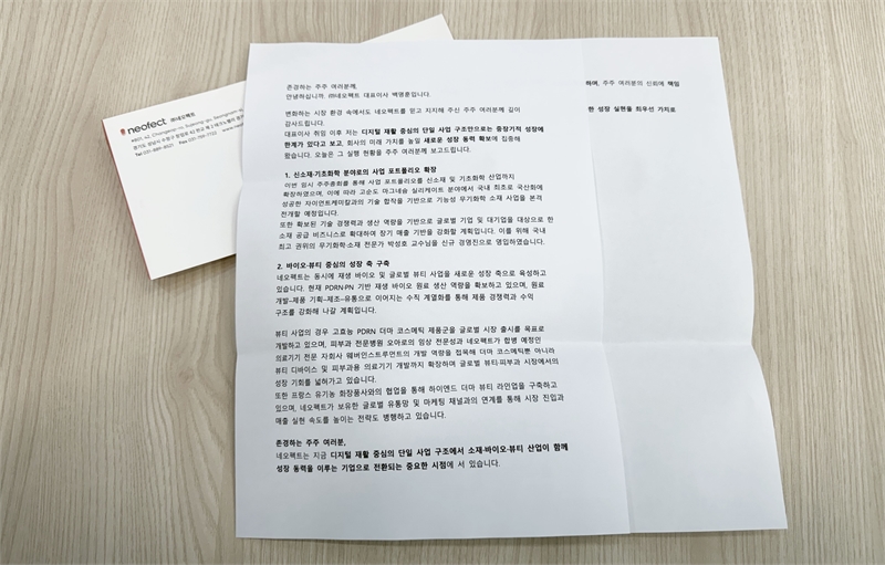 주주서한에는 그동안 네오펙트가 주주 가치를 최우선으로 고려해온 정책과 실질적인 성과들을 공유하며, 앞으로의 비전이 기재돼있다. 이러한 경영 방식은 다른 국내 주요 기업들의 주주 친화 정책과 유사한 흐름을 보이지만, 오프라인 편지를 통해 주주와 회사의 성장 전략을 공유했다는 점은 이례적이란 평가다.