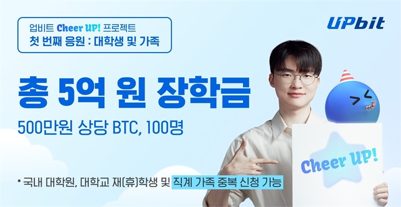 첫 번째 캠페인인 ‘업비트 응원 장학금’은 미래 준비 과정에서 경제적 부담을 겪는 청년층을 돕기 위한 프로그램이다. 총 100명을 선발해 1인당 500만원 상당의 비트코인(BTC)을 장학금으로 지원한다. 학자금, 자격증 준비, 직무 교육 등 청년들이 미래 가능성을 확장하고, 진로를 찾아가는 데 필요한 비용을 지원하기 위해서다.
