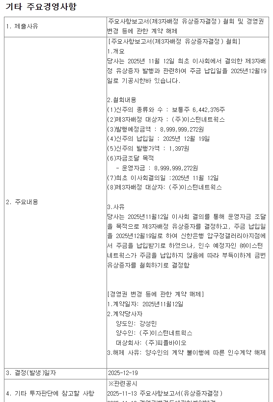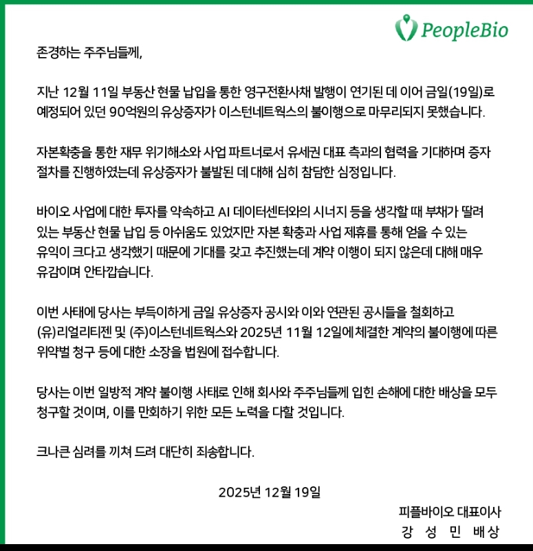 피플바이오는 증자 철회 사유로, 인수 예정자인 이스턴네트웍스가 주금을 19일까지 납입하지 않았기 때문이라고 설명했다. 양수인의 계약 불이행에 따라 경영권 인수계약도 해제한다고 밝혔다.