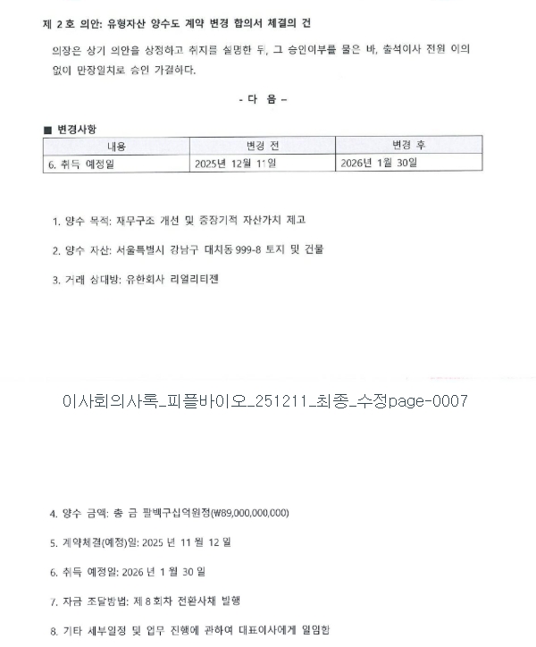CB 대금과 부동산 매각대금 270억원은 서로 상계하는 방식이다. 이 거래가 완료되면 피플바이오는 인수대금을 현찰로 따로 줄 필요없이 대치동 부동산 대출금만 전액 떠안으면 된다는 얘기다.
