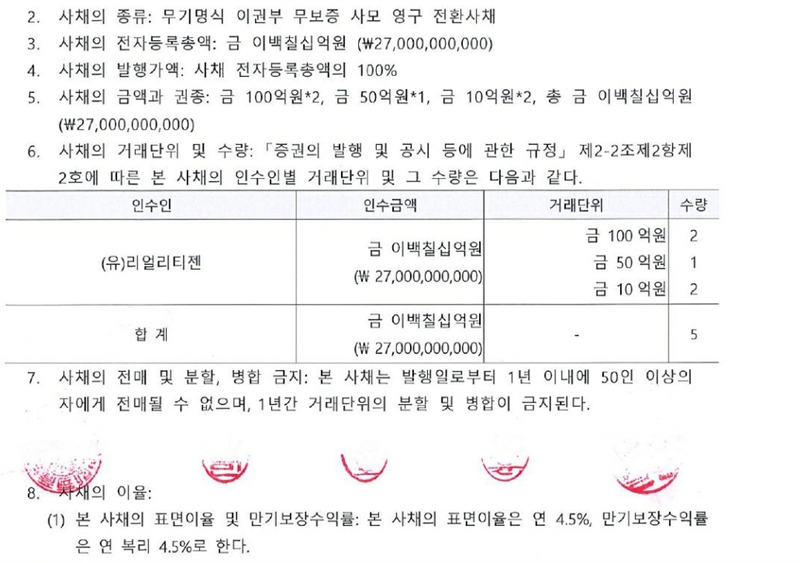 또 CB 인수자가 중도상환(풋옵션)을 요구할 수 없고, 3년 후부터 발행회사가 중도상환(콜옵션)을 할 수 있어 부채가 아닌 자본으로 인정받을 수 있는 CB였다. 장부상 부채비율이나 자본잠식을 개선할 수 있는 카드이기도 했다. 부동산 매매대금 납입일과 CB 대금 납입일은 똑같이 지난 11일이었다.