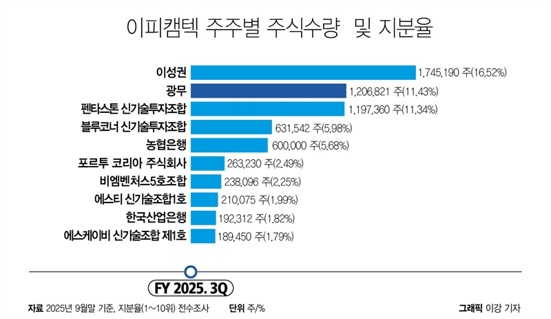 이피캠텍 주주별 주식수량 및 지분율(2025년 3분기 말 기준). ⓒ그래픽=더트래커/이강기자