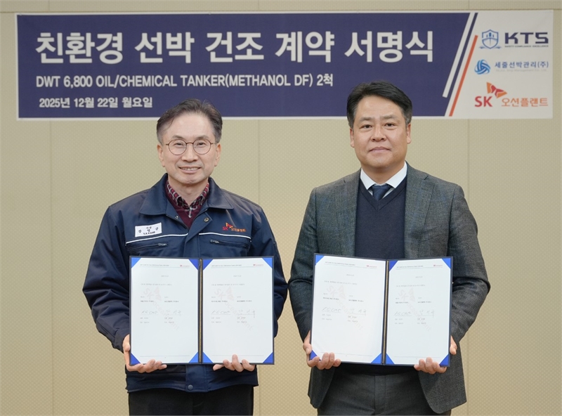 SK오션플랜트는 케이티에스해운과 세줄선박관리로부터 6800톤급 메탄올 이중연료 오일·케미컬 탱커 각 1척씩, 총 2척의 건조 계약(총 약 600억원 규모)을 체결했다고 23일 밝혔다.