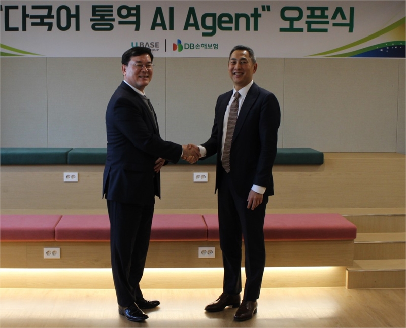 지난 18일 서울 중구 유베이스 본사에서 장영석 DB손해보험 본부장(왼쪽)과 목진원 유베이스 대표가 '다국적 통역 AI 에이전트' 오픈식을 진행하고 기념촬영을 하고 있다.[사진=DB손해보험 제공]