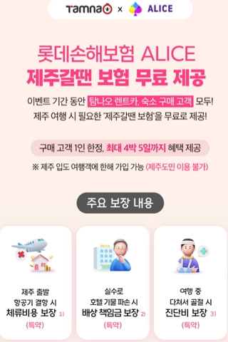 탐나오에서 제주 여행 상품을 예약하는 고객은 롯데손해보험의 ‘제주갈 땐 보험’에 무료로 가입할 수 있다.