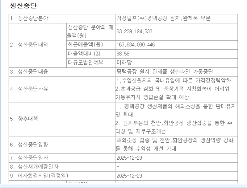 공시에 따르면 생산 중단 이유는 수입산 원지의 국내 유입에 따른 가격경쟁력 약화에다 초과공급 심화로 중장기적 시황 회복도 어려워 가동 유지시 영업손실이 더 확대될 것으로 예상되기 때문이라고 밝혔다.