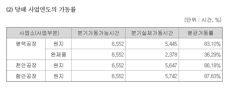 올 1~9월 매출 중 원지 비중은 58%, 완제품은 30% 정도다. 올 1~9월 평균 가동률은 평택공장 원지 부문이 83.10%이나 완제품은 36.29%에 그쳤다. 천안 및 함안공장의 평균가동율은 각각 86.18%, 87.63%다. 평택공장 완제품 라인의 가동률이 특히 낮았다.
