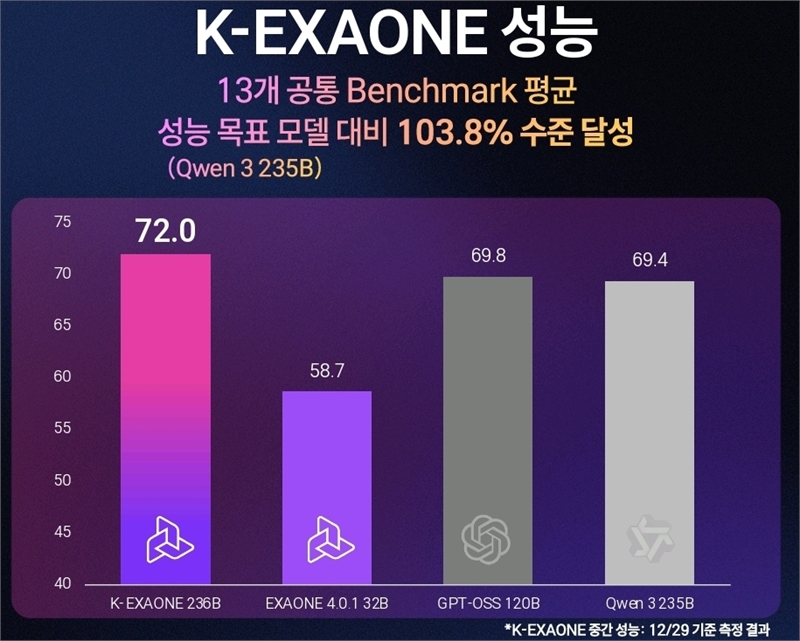 K-엑사원은 1차 평가 벤치마크 13종의 평균 점수에서 72.03점을 달성해 1차 목표 모델인 큐웬3 235B(69.37점) 대비 104%의 성능을 달성했다.