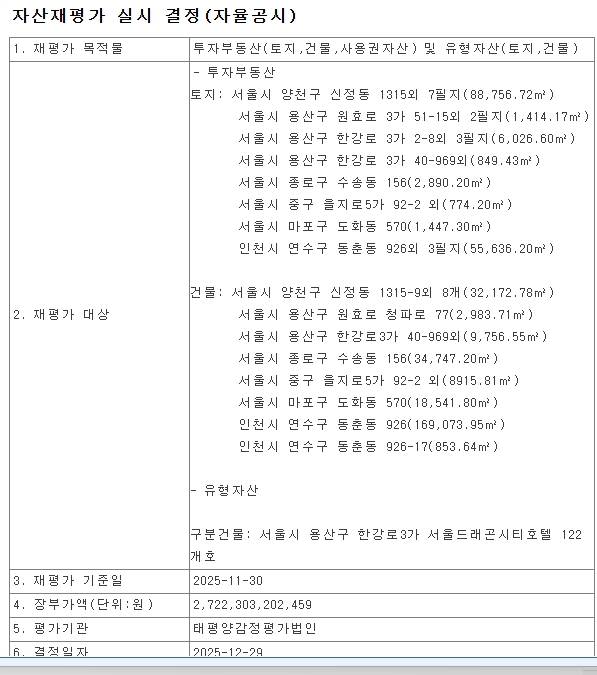 재평가 기준일은 지난 11월30일이며, 재평가 대상 부동산의 장부가액만 2조7223억원에 달한다. 평가기관은 태평양감정평가법인이다.