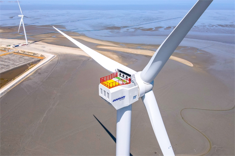 두산에너빌리티가 국내 기술로 독자 개발한 8MW급 해상풍력 발전기(DS205-8MW) 전경.[사진=두산에너빌리티 제공]