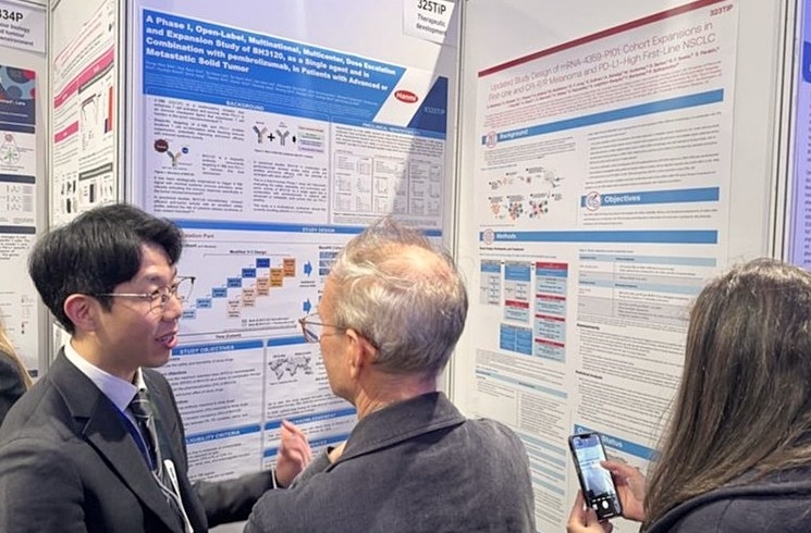 김성중 한미약품 ONCO임상팀 선임연구원이 지난달 11일(현지시간) 영국 런던에서 열린 유럽종양학회 면역종양학 학술대회에서 BH3120의 임상 경과가 담긴 포스터 내용을 설명하고 있다.[사진=한미그룹 제공]
