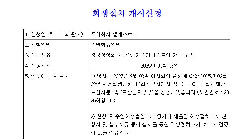 더트래커 = 박지훈 기자진단전문 기업 셀레스트라(옛 클리노믹스)가 기업회생절차를 신청했다. 관리종목 지정 매출 기준을 넘기기 위해 비핵심 사업 투자로 유동성에 타격을 입은 것이 도화선이 됐다, 회사는 감사의견 거절을 받으면서 상장폐지 심사 절차를 밟고 있는 가운데, 스토킹호스 구조를 활용한 매각을 병행하고 있다. 9일 투
