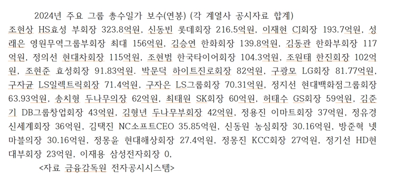 조 회장 다음으로 작년 보수를 많이 받은 회장 또는 총수들을 보면 신동빈 롯데그룹 회장(216.5억원), 이재현 CJ 회장(193.7억원), 성래은 영원무역그룹 부회장(최대 156억원), 김승연 한화 회장(139.8억원), 김동관 한화 부회장(117억원), 정의선 현대차 회장(115억원), 조현범 한국타이어 회장(104.3억원), 조원태 한진 회장(102억원) 등이 모두 연봉 100억원을 넘었다.