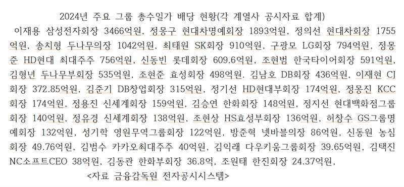 이 회장 다음으로 작년 배당을 많이 받은 회장들은 정몽구 현대차 명예회장(1893억원), 정의선 현대차 회장(1755억원), 송치형 두나무 의장(1042억원), 최태원 SK 회장(910억원), 구광모 LG 회장(794억원), 정몽준 HD현대 최대주주(756억원), 신동빈 롯데 회장(609.6억원), 조현범 한국타이어 회장(591억원), 김형년 두나무 부회장(535억원) 등이다. 모두 500억원을 넘었다.