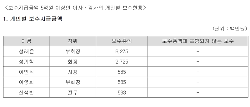 이 회사는 비상장이라 대표이사 연봉을 공시하지 않는다. 아직 작년 감사보고서도 내놓지 않고 있다. 2023년 감사보고서를 참조하면 그해 경영진급여 합계는 30억원이었다. 임직원수가 모두 15명에 불과한 회사라, 경영진은 성래은 대표 혼자일 가능성이 높다.