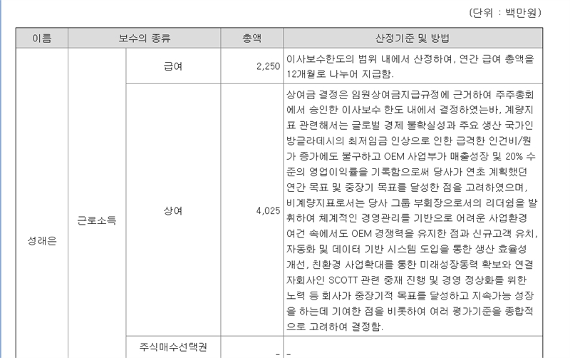 이게 맞다면 23년 성 대표 연봉은 30억원이고, 작년에도 적어도 이 정도 연봉은 받았을 것으로 추정된다. 이 회사에서 받은 작년 연봉이 최대 30억원이라고 가정(물론 그보다 적을 수 있다)할 때 위 3개사에서 받은 연봉합계가 최대 156억원이라는 얘기다.