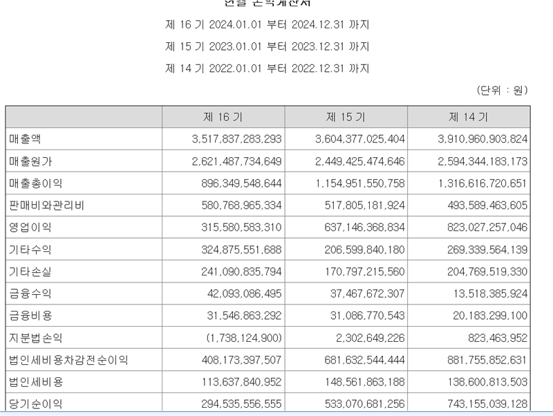 영업이익도 2022년 8230억원에서 23년 6371억원, 작년 3156억원 순이고, 같은 기간 당기순익도 7432억원, 5331억원, 2945억원씩으로, 매출 감소폭보다 감소 속도가 더 가파르다.
