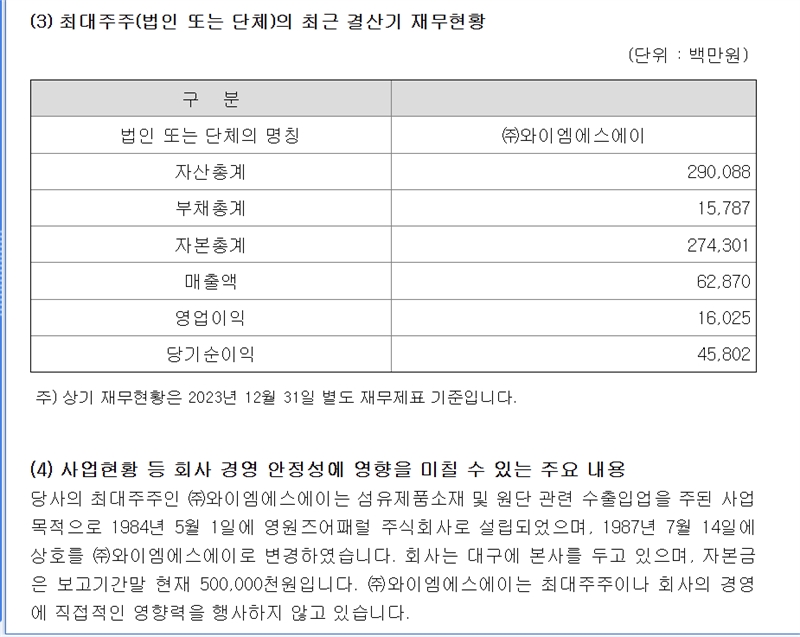 2022년 말 이 회사의 별도기준 자산총계는 2453억원이었다. 전 자산의 3분의 1을 성 부회장에게 한꺼번에 빌려줬던 셈이다. 이것이 너무 벅찼던지 이 회사는 이 대여금 마련을 위해 당시 본사 건물로 사용하던 대구 동구 만촌동 빌딩을 영원무역에 587억원에 긴급 매각했다.