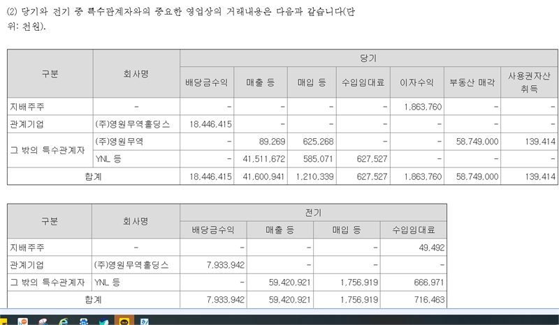 YMSA와 영원무역그룹 계열사들간의 내부거래 공시