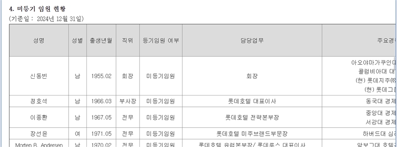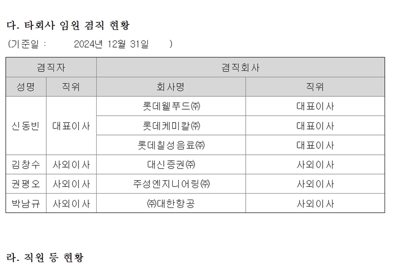24년 말 기준 신동빈 롯데지주 대표이사 회장의 타 계열사 대표이사 겸직 현황