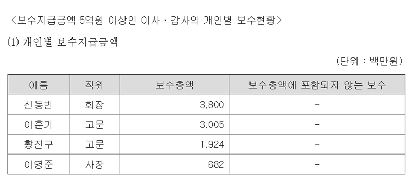 현재 신 회장은 공시로 확인된 것만 최소 롯데 주력기업 7곳의 회장이라는 얘기다. 신 회장은 7곳 모두에서 작년 보수 216.5억원을 받았다. 이 연봉은 작년 효성그룹 분할로 퇴직금 및 특별공로금을 많이 받아 작년 보수 323.8억원을 기록한 조현상 HS효성 부회장을 제외하면 재벌총수들 중 사실상 1위다.