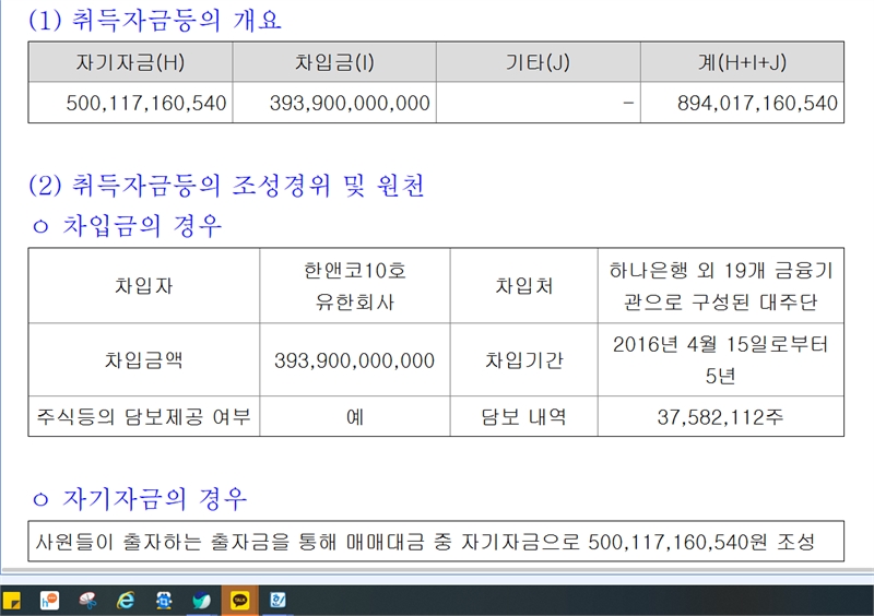 2016년 인수 당시 일부 인수자금 조달경로 관련 공시