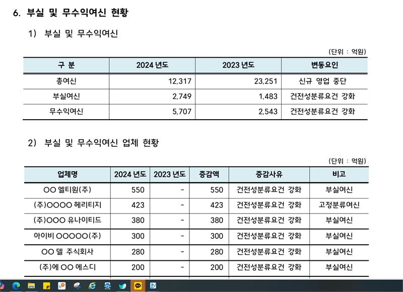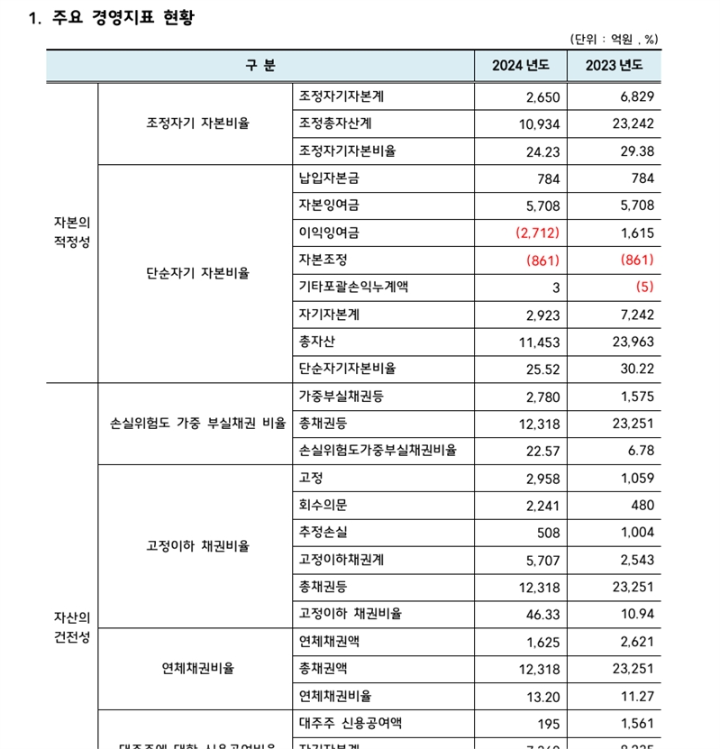 역시 각종 부실 확대로 손실충당금 전입액이 23년 762억원에서 작년 1413억원으로 크게 늘면서 같은 기간 영업손익이 228억원 흑자에서 795억원 적자로 바뀌었다. 같은 기간 당기손익도 311억원 흑자에서 747억원 적자로 적자전환했다.