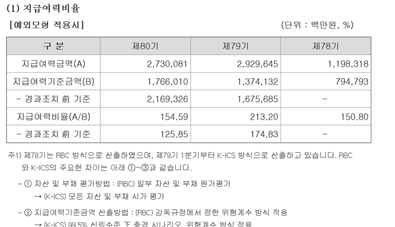 할인율 산출기준 등 제도 강화가 지속되고 있고, 경과조치 효과의 점진적 소멸로 경상적인 자본관리 부담이 존재해 대체 자본확충 수단이 확보되지 않은 경우 킥스비율 하락이 지속될 것이라고도 예상했다.