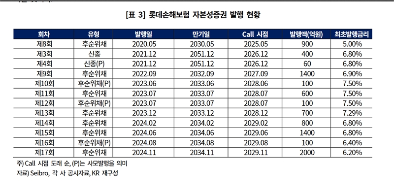 한기평에 따르면 롯데손보의 기발행 자본성 증권 중 앞으로 콜옵션 시점이 도래하는 물량은 2026년 12월 460억원, 2027년9월 1400억원 등이다. 연내 조기 상환이슈 해당물량은 더 없으나 시장에서의 평판 저하로 자본성증권 신규 발행을 통한 자본확충이 쉽지 않을 것으로 예상되는 점이 상당한 부담이라고 한기평은 지적했다.