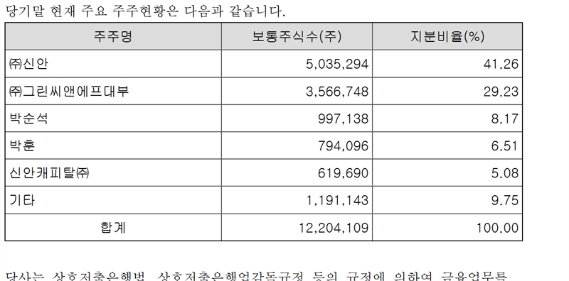 작년 말 기준 바로저축은행의 주요 주주들은 신안그룹 모기업 격인 신안(41.26%), 그린씨앤에프대부(29.23%), 박순석 회장(8.17%), 박 회장 장남인 박훈 사장(6.51%), 신안캐피탈(5.08%) 등이다.