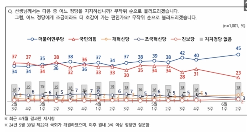 정당 지지도에서는 더불어민주당 지지도가 45%, 국민의힘의 지지도는 23%로 집계됐다. 대선 전인 지난달 19∼21일 이뤄진 직전 조사 결과와 비교하면 민주당 지지도는 5%포인트(p) 상승했고, 국민의힘 지지도는 8%p 하락했다. 양당 지지도 격차는 9%p에서 22%p 차이로 벌어졌다.