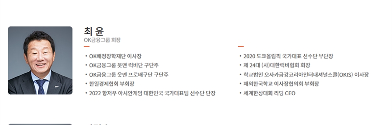 오케이금융그룹 최 윤 회장과 그가 현재 맡은 주요 보직(홈페이지)