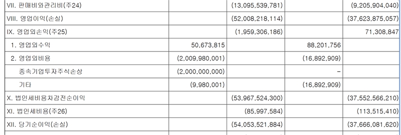 종속 자회사 실적을 제외한 별도기준으로 따져도 작년에 적자가 더 커졌다. 별도기준 영업손익은 23년 376억원 적자에서 작년 520억원 적자, 같은 기간 당기손익은 376억원 적자에서 540억원 적자를 각각 기록했다.