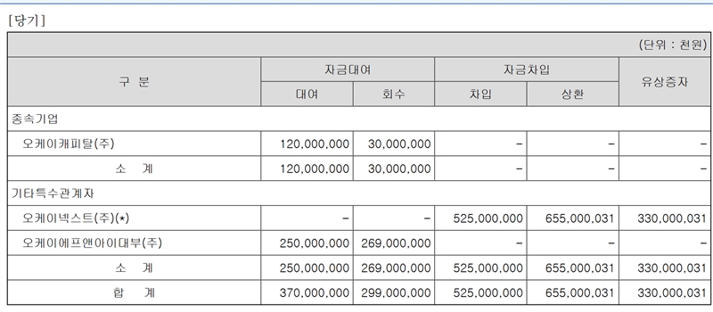 이 차입금에서 생긴 재원으로 오케이캐피탈에 4900억원(연 7.06~8.48%), 오케이에프앤아이대부에 2500억원(연 7.81%)씩 빌려주고 있다. 대출보다 차입금이 3293억원이나 더 많다.
