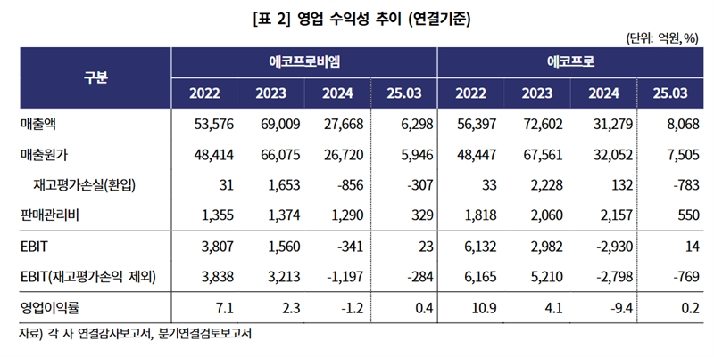 에코프로비엠과 에코프로의 영업수익성 추이(한기평 정리)