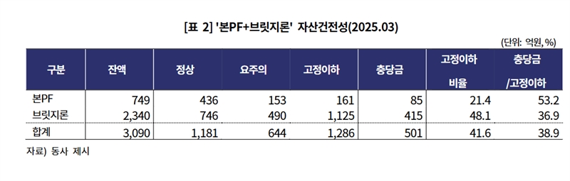 한기평은 이 저축은행이 현재 부실PF 정리를 진행 중이지만 지난 3월 말 부동산PF대출의 고정이하여신비율이 41.6%, 충당금/고정이하여신 비율이 38.9%로, 건전성이 여전히 매우 미흡하다며 고정이하PF 매각을 확대하고 있으나 신규부실 발생이 지속되고 있다고 지적했다.
