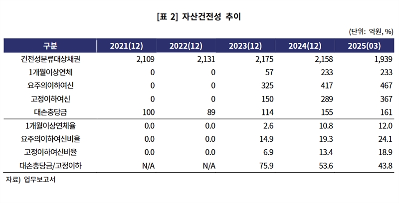 나신평에 따르면 이 회사의 자기자본 대비 순고정이하자산비율은 2025년 3월말 기준 32.5%로, 2022년 말 3.8% 대비 크게 높아졌다.
