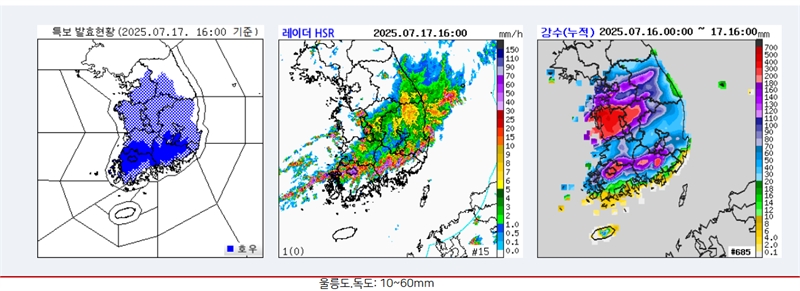 17일 오후 4시기준 속보발령및 기상레이더 지도