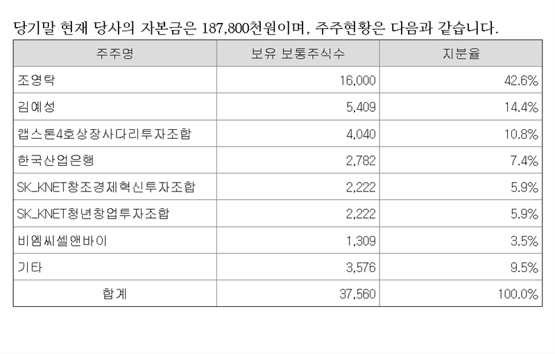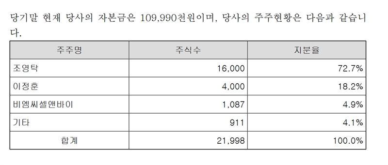 2015년 말 이 회사의 주주 구성은 창업자인 조영탁 대표가 73%로, 압도적 최대주주였고, 그 다음은 이정훈 이란 인물이 18%, 계열사인 비엠씨셀앤바이가 상호출자 형태로 4.9%, 기타 4.1% 등이었다. 당시 주주수는 모두 7명. 유상증자 액수는 2014년 5.5억원, 15년 3.5억원에 불과했다. 이들 주주 7명이 나눠 부담한 유상증자였다.