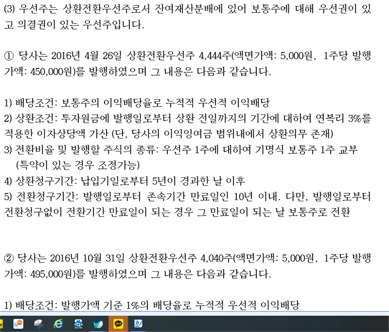 누적적 우선적 이익배당, 연복리 3%의 만기상환조건, 발행일부터 당장 가능한 주식전환 청구, 납입기일 5년(2018년 이후 발행분은 3년) 후부터 가능한 조기상환청구권(풋옵션) 등의 조건들도 붙였다.