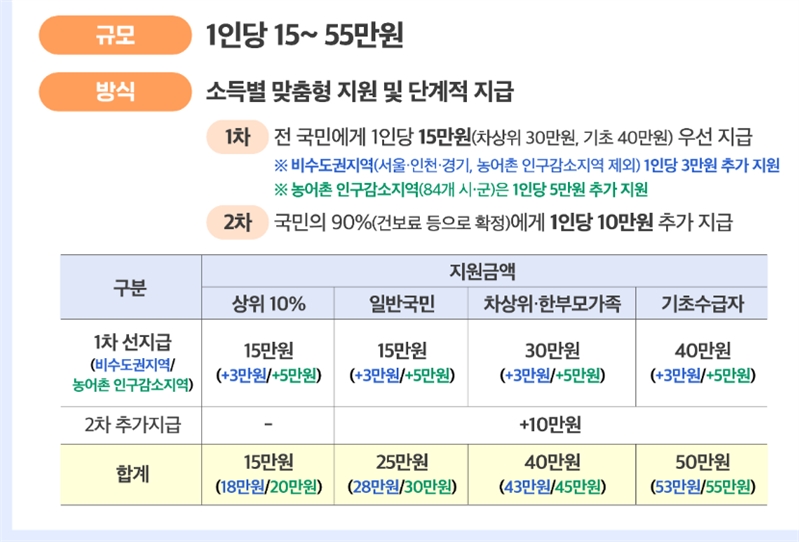 지원 금액은 국민 1인당 기본 15만원이며 차상위계층과 한부모가족은 1인당 30만원, 기초생활수급자는 1인당 40만원을 받는다. 서울·인천·경기를 제외한 비수도권 지역 주민에게는 추가로 3만원, 농어촌 인구감소지역 83개 시군 주민에게는 5만원이 추가로 지급된다.