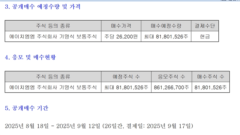 HMM은 지난 8월18일부터 지난 12일까지 진행한 자사주 8180만1526주(7.98%)에 대한 공개매수 결과 8억6126만6700주가 응모해 이 중 8180만주(7.98%)를 매입했다고 17일 밝혔다. 1주 당 공개매수 가격은 2만6200원으로, 이번 자사주 총 취득 규모는 2조1432억원에 달한다.