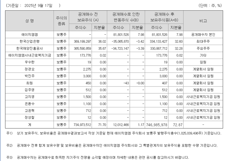 산업은행과 해양진흥공사는 이번 공개매수를 통해 각각 3506만5870주(3.42%), 3472만3147주(3.39%)를 처분했다. 공개매수로 산업은행의 HMM 지분율은 청약 이전 36.02%에서 32.60%로 줄었다. 해양진흥공사의 HMM 지분율도 35.67%에서 32.28%로 3.39%포인트 줄었다.