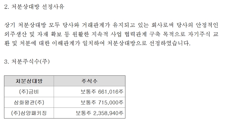 광동제약과 삼화왕관, 금비 3사는 이번 자사주 거래의 목적을 ‘지속적 사업협력관계 구축’이라고 모두 똑같이 밝혔다. 오랜 거래 관계인 4사가 자신들의 자사주 처분 방법 등을 놓고 사전에 충분히 협의한 증거로 보인다.