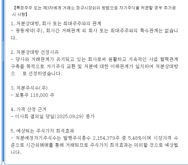 상장사 금비도 광동제약 자사주 66만1016주를 받는 대신 자사의 자사주 6.5% 65000주를 주당 6만원, 39억원에 광동제약에 장외처분했다. 역시 자사주 상호교환이다.