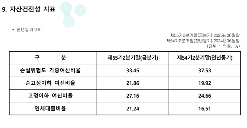 다만 이 저축은행의 손실위험도가중여신비율은 지난 6월 말 29.68%로 여전히 업계 최상위권이다. 그동안 부실대출 등을 크게 줄였는데도 위험해 보이는 부실여신들이 여전히 많다는 얘기다. 지난 6월 말 연체율을 보면 부동산PF대출이 27%, 건설업대출이 18%, 부동산업대출이 16%에 각각 달한다.