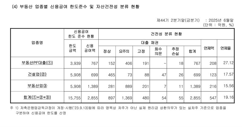 부실 자산이나 고금리 예금들을 대거 정리하면서 대출-예금-자산 모두 대폭 감소했다. 그런데도 지난 6월 말 연체율은 부동산PF대출이 38%, 건설업이 38%, 부동산업이 47%에 각각 달한다. 아직도 부실을 정리해야할 부동산관련 대출들이 많다.