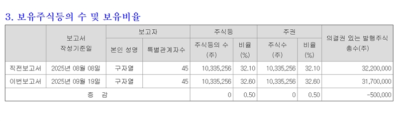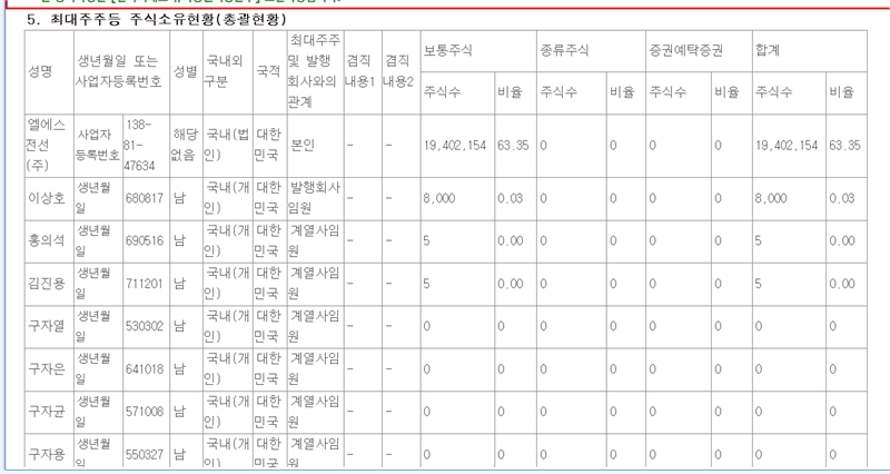 지난 9월19일 기준 LS의 최대주주및 특수관계인 지분 합계