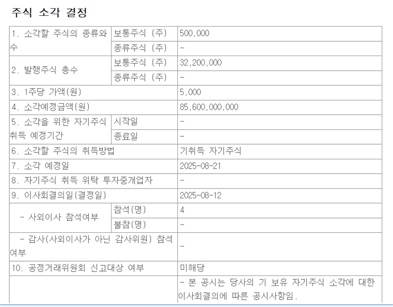 설령 남은 자사주를 모두 소각해도 큰 손해는 아닐 것으로 보인다. 소각 분 만큼 최대주주 측 지분율도 같이 올라가기 때문이다. 자사주는 또 소액주주 등의 환심을 사야할 필요가 있을 경우 조금씩 소각하는 카드로도 쓸 수 있다.